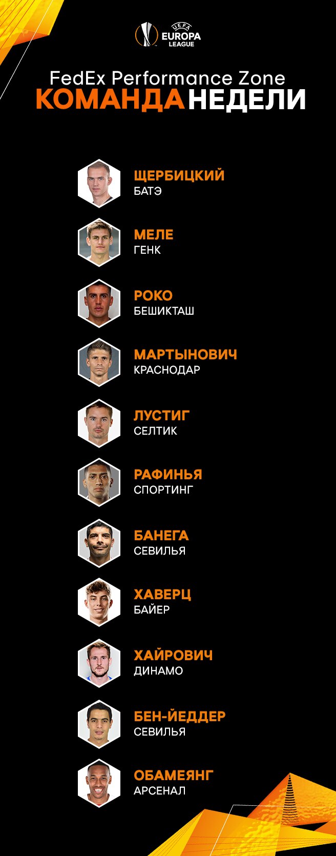 Примечание: Рейтинг FedEx Performance Zone учитывает выступления игроков в еврокубках и на внутренней арене, однако Команда недели формируется исключительно на основании прогресса в конкретный игровой день Лиги Европы.